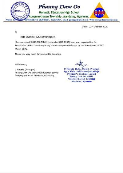 Help Myanmar is a Burmese grassroot 501c3 nonprofit. All are volunteers. Zero administration cost. Direct to locals on the ground.